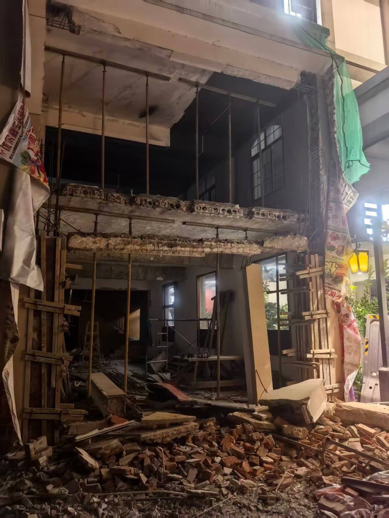 后据逝者家属杨彰提供的现场视频,该建筑承重梁已被拆除,仅使用木板支持,钢筋裸露,墙体外无防护网,也无施工标识。
